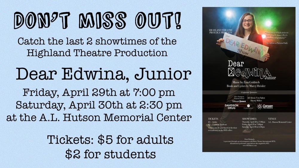 Don't miss out! You have two more opportunities to see the Highland Theatre Production of Dear Edwina, Junior: Friday, April 29th at 7 pm, and Saturday, April 30th at 2:30 pm at the A.L. Hutson Memorial Center. Tickets are $5/adults $2/students.
